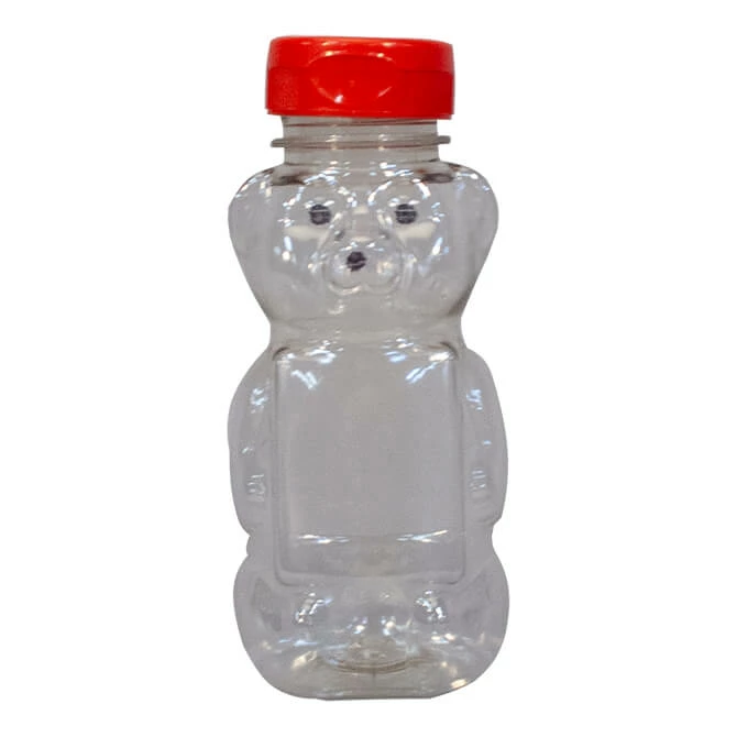 These flat panel bear containers have two flat panels, perfect for a custom honey label on front and a nutrition label on back. These 12 ounce plastic bear-shaped honey bottles are available for sale with your choice of hi-flow spouts (black, yellow or red), flip-top lids (black, red, yellow, gold or white), dripless lids (red, black or yellow) or standard white caps. The front panel measures 2 inches tall and 1-1/2 inches wide.
