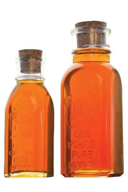 This beautifully detailed embossed 16oz. glass muth jar is a reproduction of the first jar produced specifically for honey. A traditional skep hive and flowers grace the front of the square bottle in addition to the weight of the filled jar and the word “HONEY.” These are details not generally seen in honey bottles anymore. The cork closure adds another touch of tradition to this jar. A beautiful gift or addition to your farm stand! We find these jars are very popular for wedding favors too!