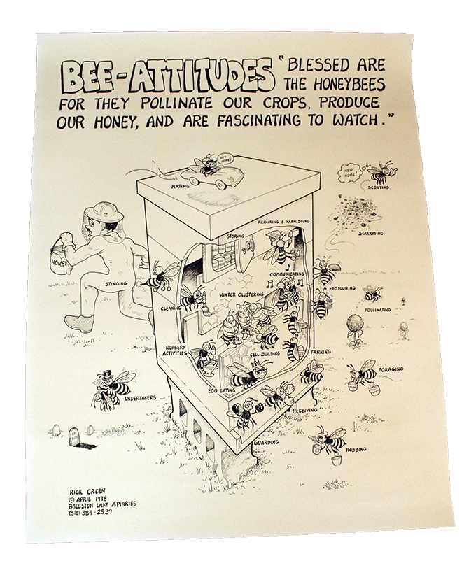 Show off the many different roles honey bees take on during their lifetimes with this informative, interesting illustration of a colony in action in and around the hive. This poster would make a great addition to a classroom, showroom, or honey-house. It is bound to spark a conversation with those who see it! Poster measures 29-7/8″ L x 21-7/8″ H.