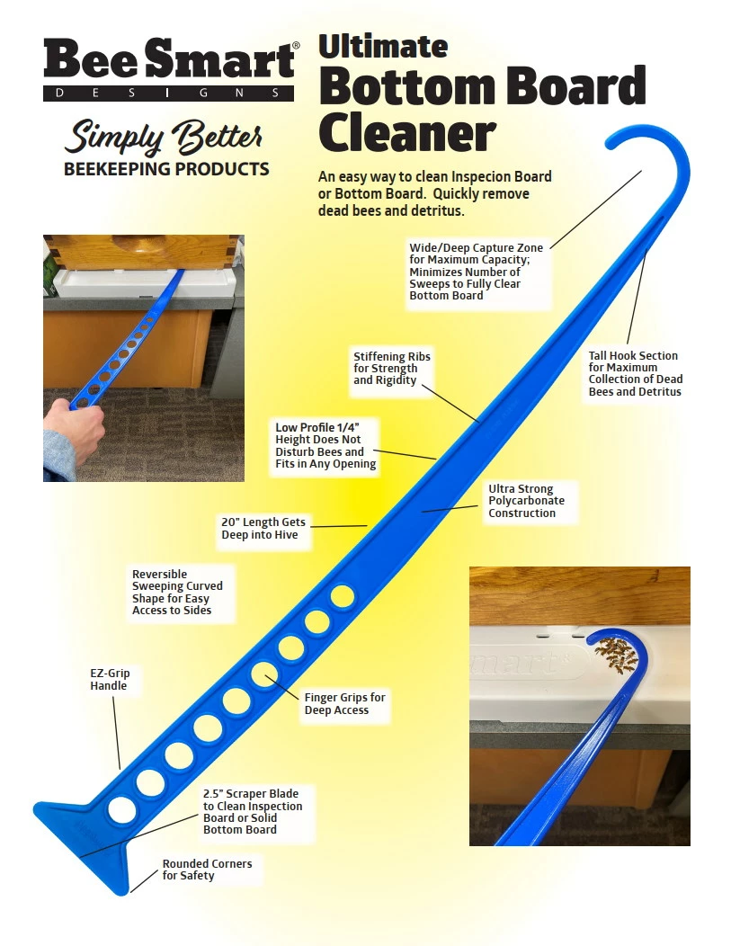 Bee Smart’s low profile bottom board cleaner works quick to remove dead bees and debris without causing disturbance to your hive. Made of ultra strong polycarbonate, you get a flexible feel with the rigid strength to get the job done.