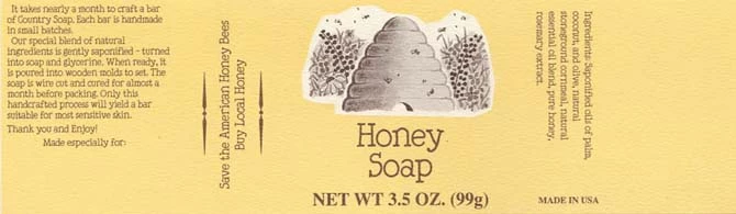 Add a fine touch of home craftsmanship to our stellar country honey soap. The label features an eye catching honey skep and lists the weight of the soap along with the ingredients.