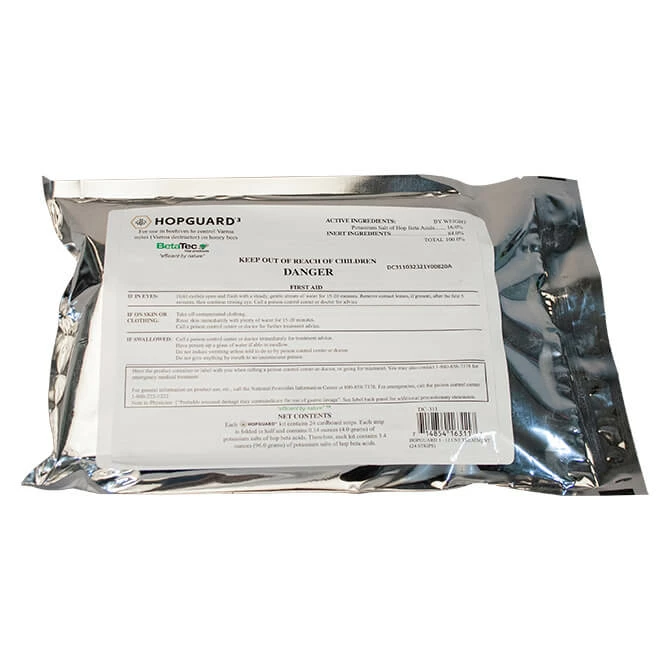 Varroa Destructor Mites (an external parasite) weaken honey bees and can lead to the demise of your hive if left untreated. HopGuard III, a strip form of pesticide, fosters the natural power of hop plants, using an extract with hop beta acids to repel mites. Two strips are applied per brood chamber for 30 days then removed.
