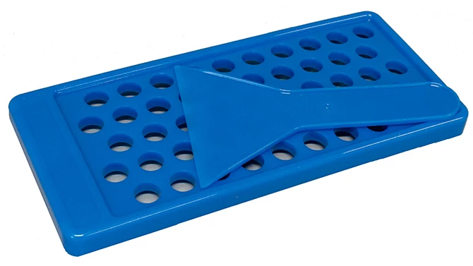 Looking to make your own unique lip balm? This is a must have tool in your lip balm making kit! Saves time and reduces waste! This handy lip balm filling tray is a great tool used to simplify the filling of 50 standard lip balm tubes. A plastic scraper is included to scrape off excess lip balm, resulting in a uniform finish on all your tubes.