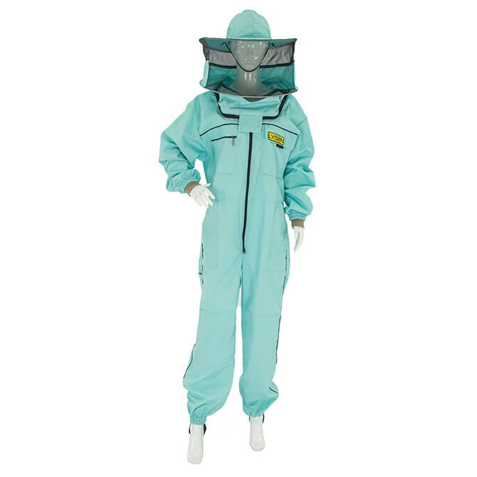 Lyson’s Color Line of suits come in exciting colors and also have the features you need. Made from a 65% polyester/35% cotton blend, the suits’ durable and breathable material ensures comfort even on hot days. The sleeves have soft elastic cuffs to ensure no bees crawl up your arm, and four pockets (two chest, two side) for all your small supplies. Elastic ankle cuffs close the pant legs, and a heal strap keeps the leg in place. The removable round veil has mesh on the back to keep the air flowing.